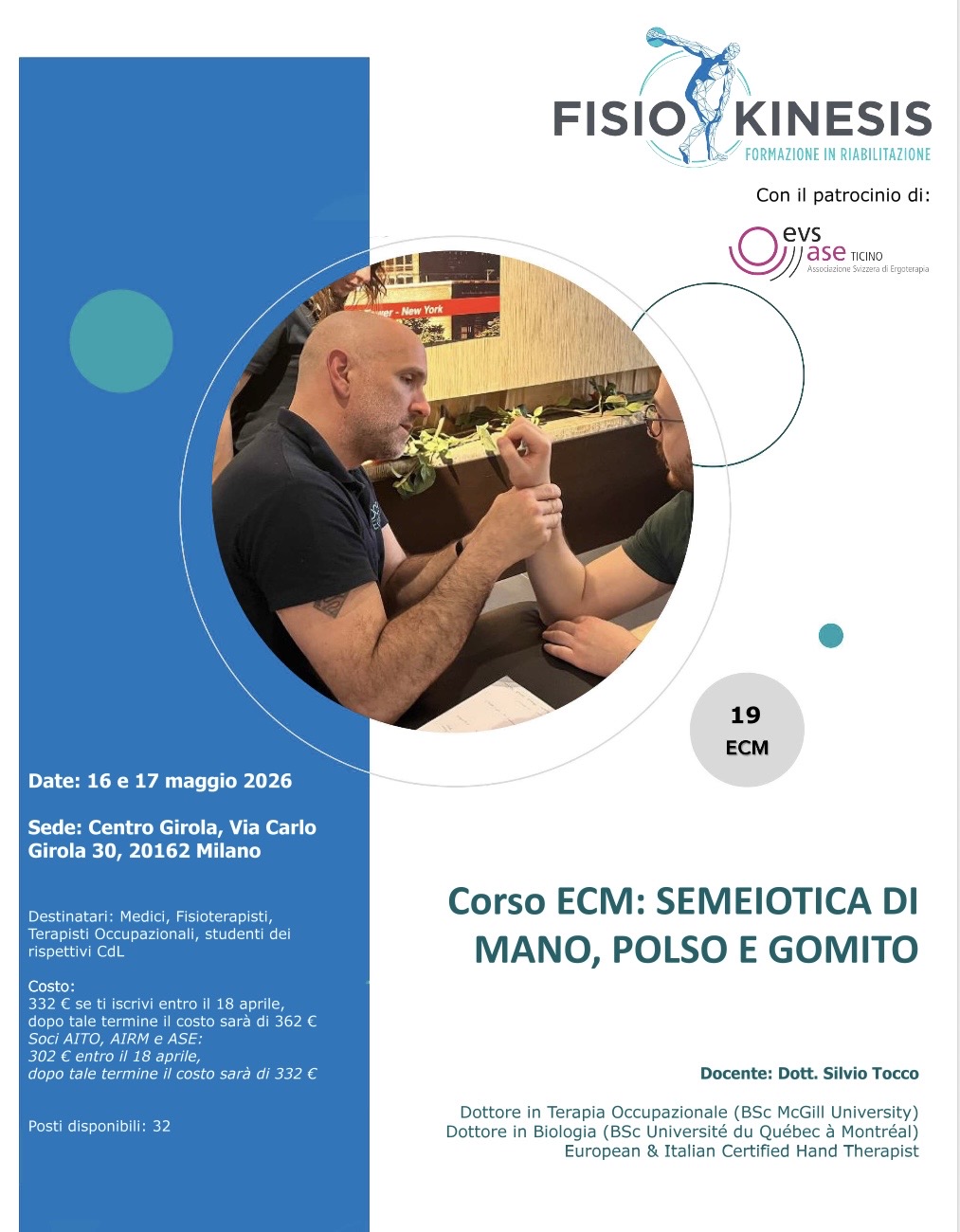 Corso ECM: SEMEIOTICA DI MANO, POLSO E GOMITO 16/17 maggio 2026 – MILANO
