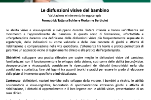 LOCANDINA Le disfunzioni visive del bambino Valutazione e intervento in ergoterapia Formatrici: Tatjana Bohler e Florianne Bertholet Le abilità visive e visuo-spaziali si sviluppano durante [...]